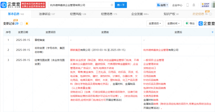 企查查APP显示,近日,顾家集团有限公司发生工商变更,企业名称变更为杭州德烨嘉俊企业管理有限公司,同时,经营范围变更为“企业管理咨询;货物进出口;日用品批发;日用品销售;针纺织品销售等”。